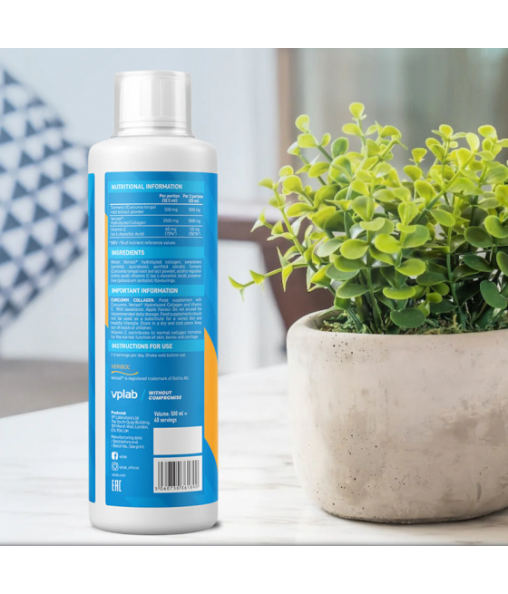 VPLAB Куркумин-коллаген, яблоко, 500 ml. Пищевая добавка с куркумой, гидролизованным коллагеном Verisol® и витамином C. С подсластителем.